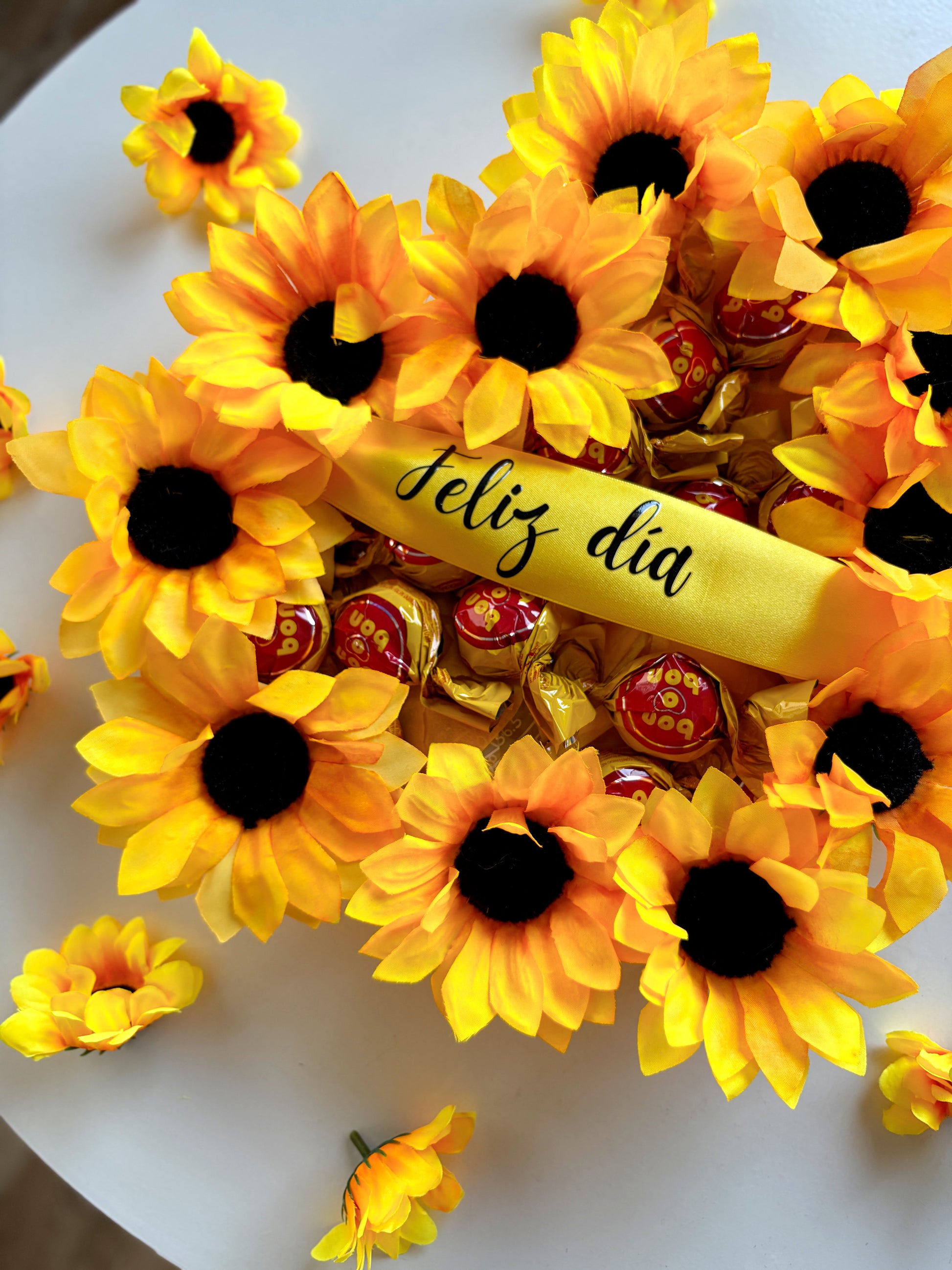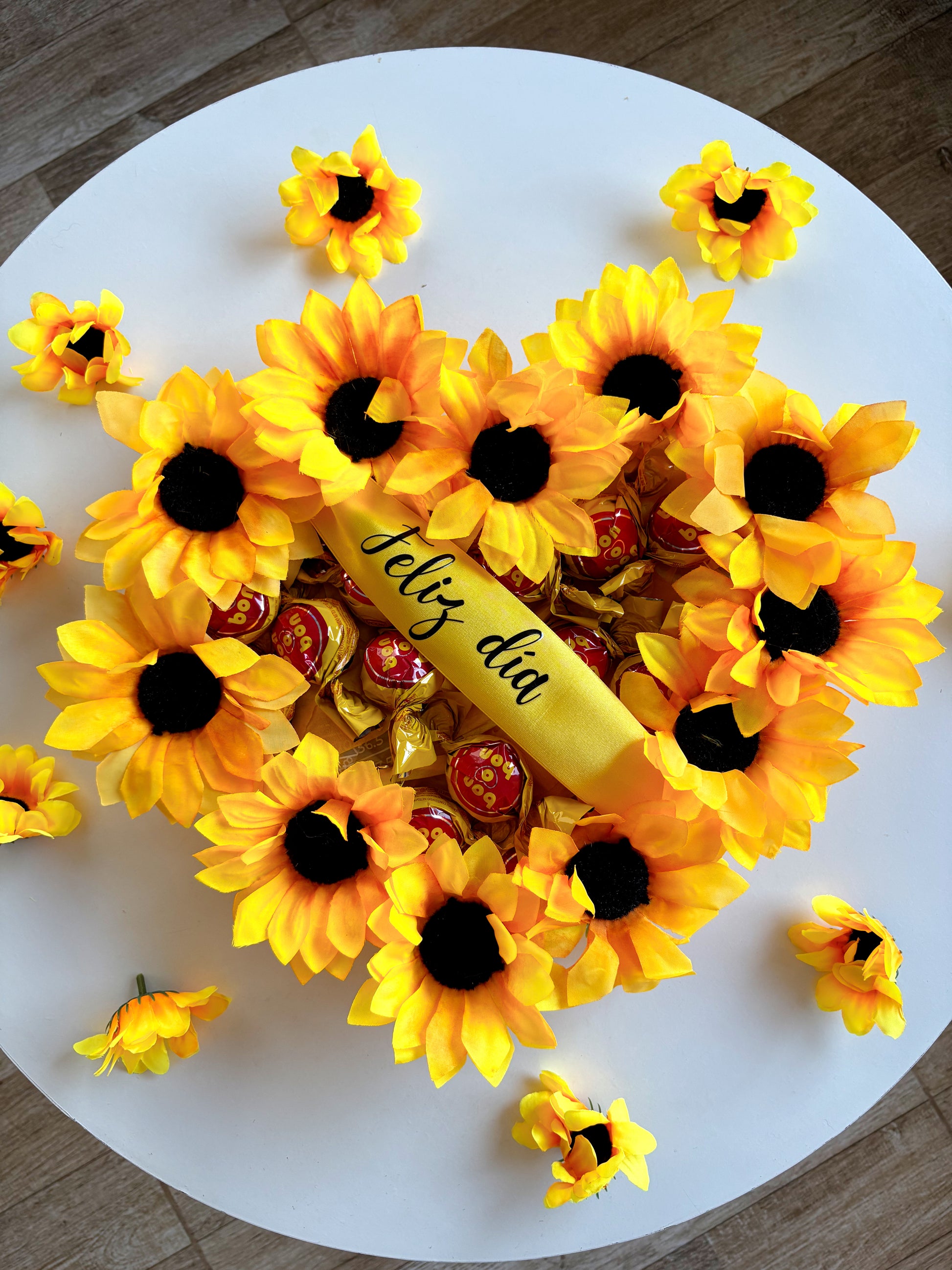 Una cajita con forma de corazón repleta de girasoles artificiales y bombones para endulzar este 21 de septiembre. Decile Feliz día con este corazón de amor 🌻❤️
