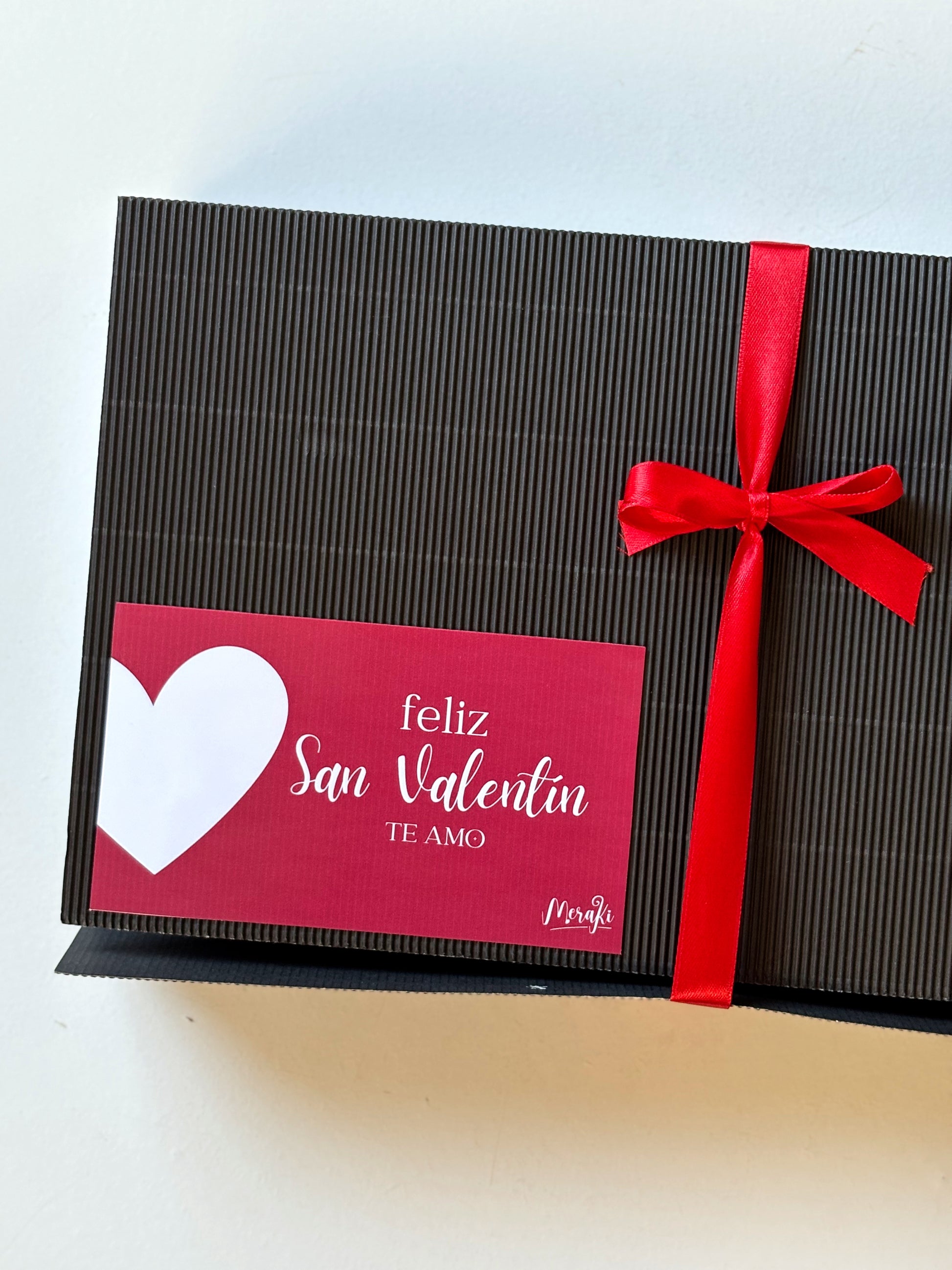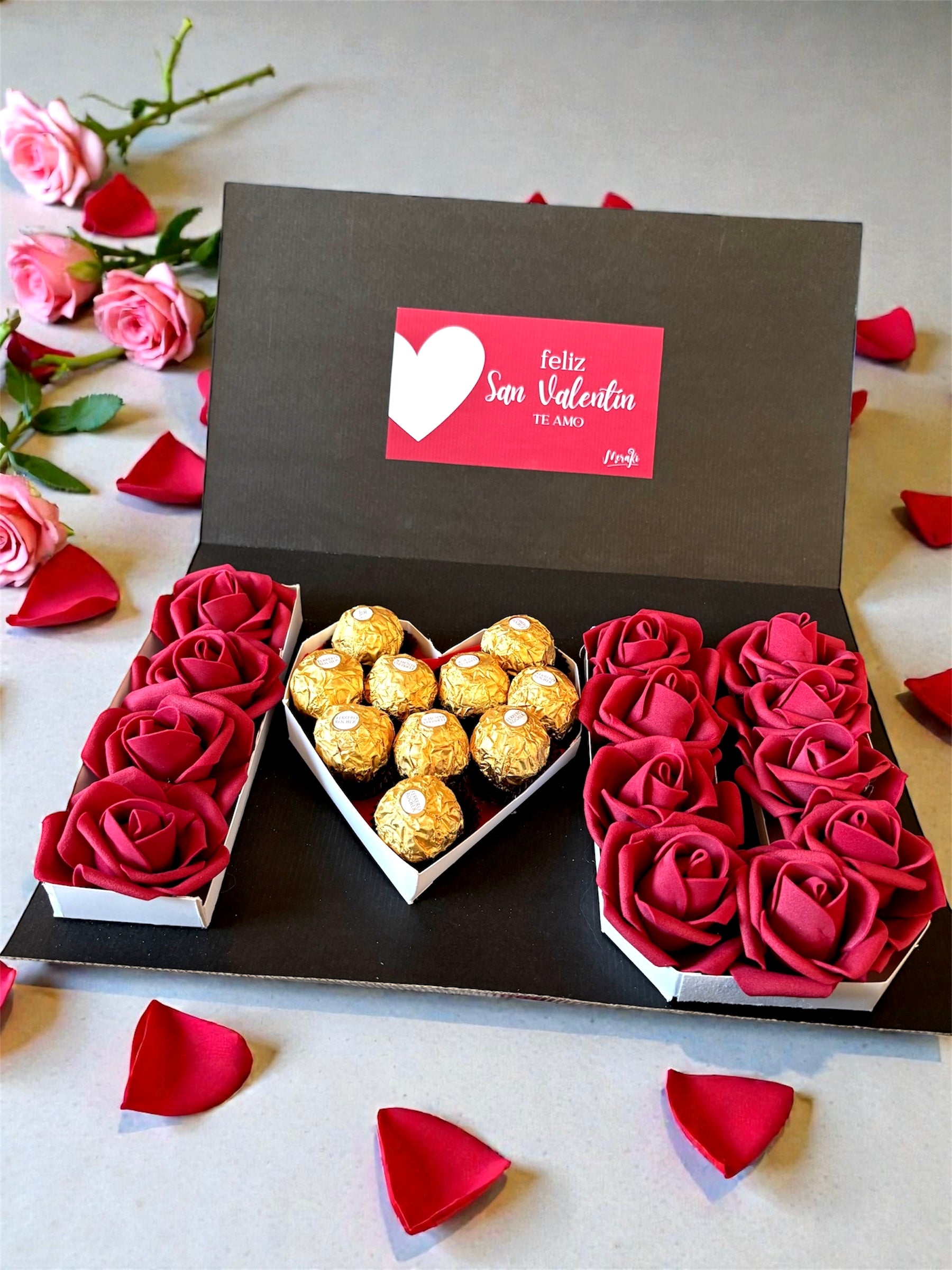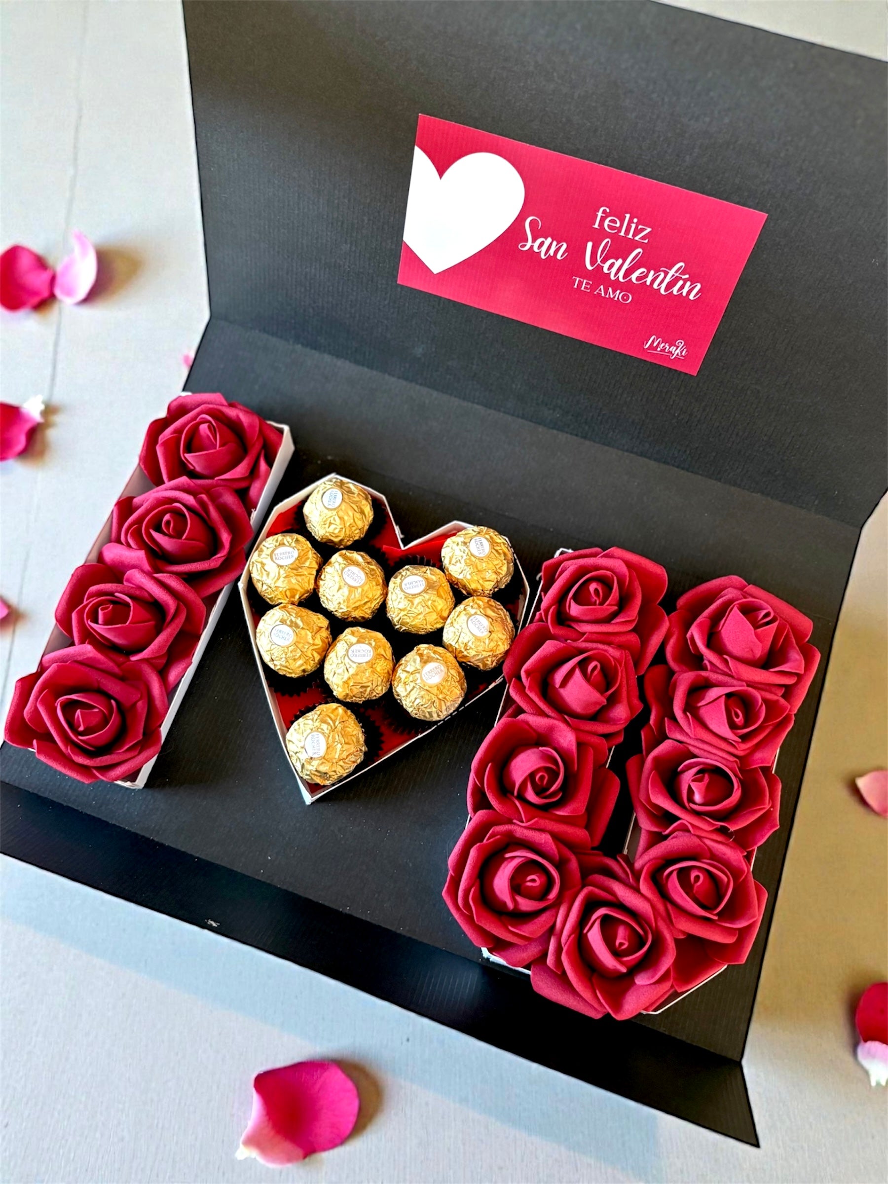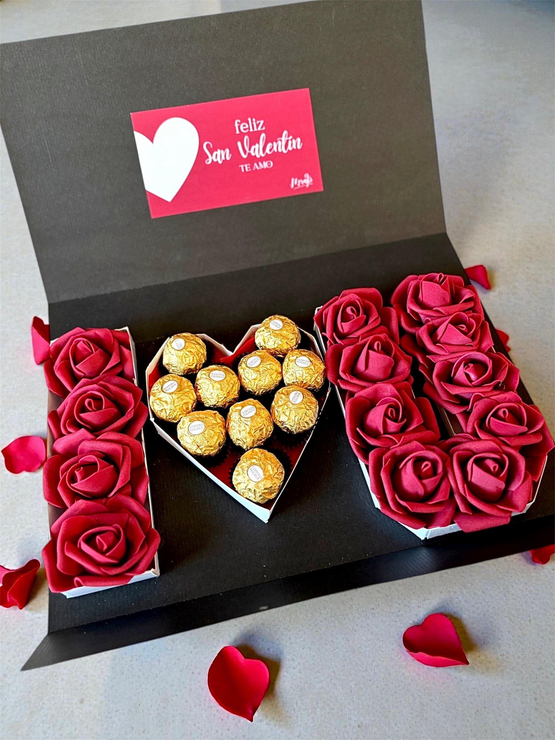 Nuestra Box habla por vos: llenas de rosas rojas, y un corazón repleto de Ferrero Rocher, un mensaje claro: Feliz San Valentín, mi amor. Te amo.